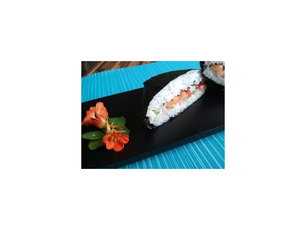 Sushi sendvič je ideální svačinou na cesty, do práce či jako zážitek z jiného druhu sushi. Do klasické sushi řasy je zabalena spousta lahodného zeleniny - avokádo, nakládaná ředkev, mrkev, okurek, paprika. Skvělou chuť doplňuje japonská majonéza a sezam.